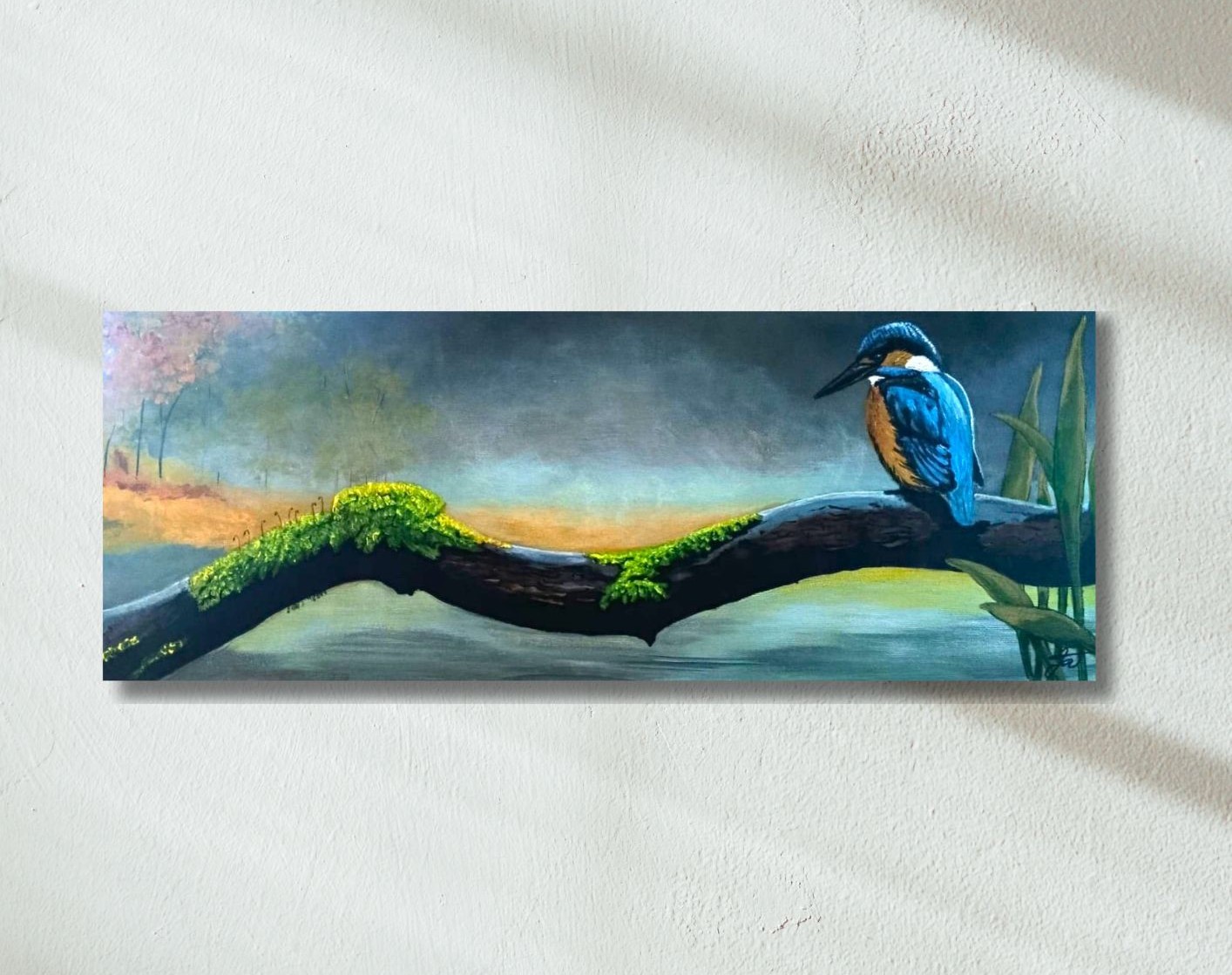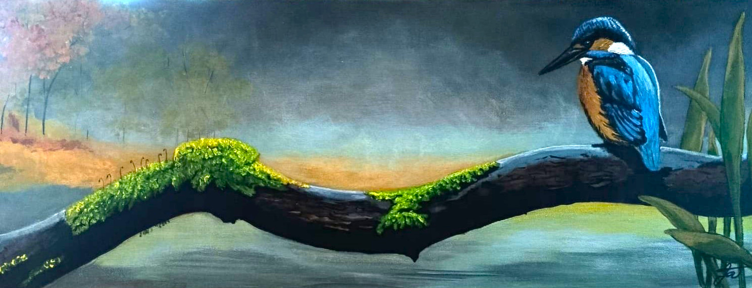 Obraz Ledňáček zachycuje jedinečný okamžik klidu a souznění s přírodou. Typický modro-oranžový pták, symbol čistých vod a tichých zákoutí krajiny, je ztvárněn jemnou, ale přitom výraznou akrylovou technikou. Protáhlý formát plátna podtrhuje dynamiku kompozice a přirozený pohyb tohoto výjimečného ptáka.