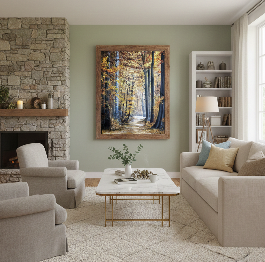 Nechte se vtáhnout do podzimního lesa, kde každý list šeptá svůj příběh. Obraz „Podzimní šepot“ zachycuje kouzlo klidné cesty lemované stromy, jejichž koruny hýří zlatavými, oranžovými a zemitými tóny. Sluneční paprsky pronikající mezi větvemi rozzáří cestu a vybízejí k tiché procházce, při níž téměř cítíte vůni spadaného listí a slyšíte jeho jemné šustění pod nohama.