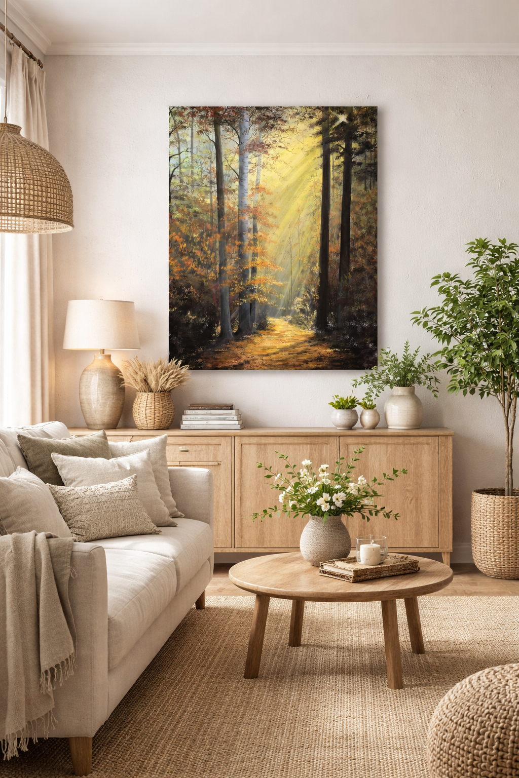 V srdci lesa je obraz plný klidu a světla – paprsky slunce pronikající korunou stromů zvou k zastavení a tichému spočinutí uprostřed přírody. Harmonická kompozice a teplé tóny listí vnášejí do prostoru atmosféru hlubokého lesa a vnitřního míru.